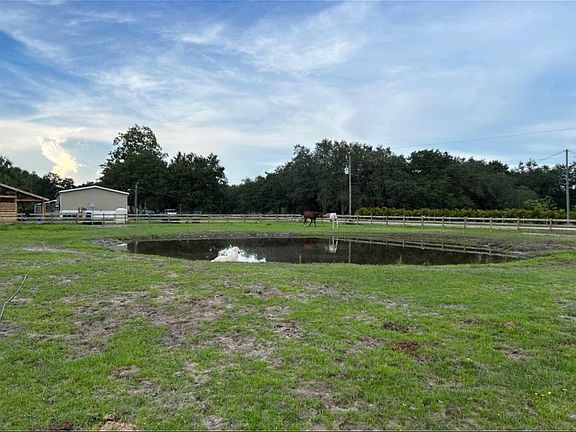 Outdoor features include open acreage, a pond, and cross-fenced areas.