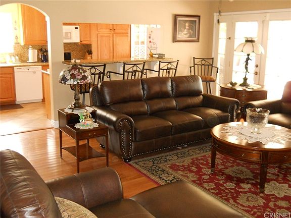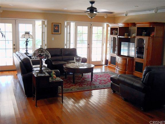 Beautiful highly upgraded and customized home in a well-established Granada Hills neighborhood. Seller has spent thousands in upgrades. Features include an open concept family room with recessed lighting, hardwood floors, and built in speakers. Crown molding and hardwood throughout the home. Breakfast bar to gorgeous open kitchen with granite counters, bay window, tile floors and built-ins. Custom spacious Formal Dining Room with beautiful chandelier and custom wet bar. All lead out through French doors to an entertainers covered patio with ceiling fans, speakers, and tropical solar and gas heated saltwater pool and spa in the beautifully landscaped and private back yard. Large master suite with dual sinks, jetted tub, and walk in closet. All bathrooms remodeled with granite and tile. Good size bedrooms and one with built in Murphy bed all have ceiling fans and custom organized closets. Great curb appeal with security fencing in front, RV parking, and 2 car attached garage with built-in cabinets and electric opener. Automatic sprinkler and drip systems front and back. Central heat and air with dual attic access. Door alarms installed to warn if doors opened for swimming pool access.