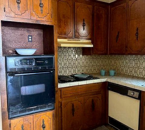 Fenced yardPink stucco homeTiled kitchenOriginal wooden floors