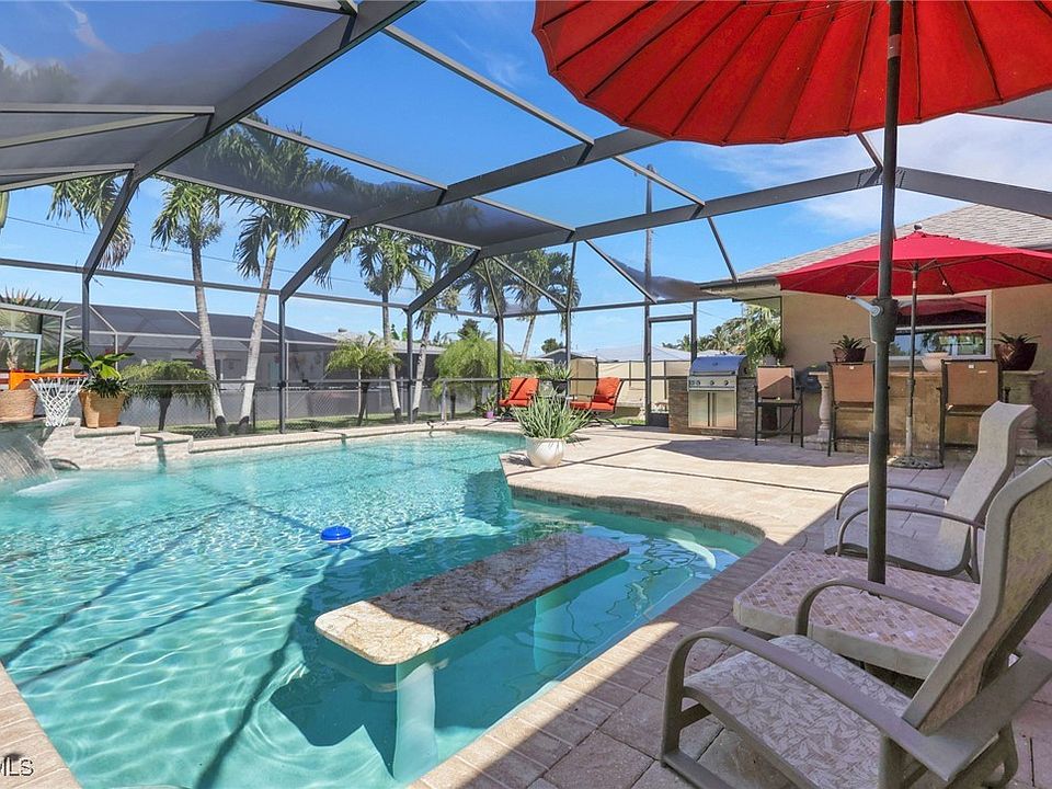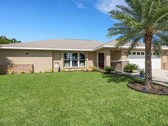 Look no further—this stunning home has it all. Situated on an oversized corner lot in the desirable Waterway Estates community, this property offers the ultimate Florida lifestyle. Pride of ownership shines throughout, as the home has been meticulously maintained and thoughtfully updated. The lushly landscaped yard is a true tropical oasis, featuring dozens of beautiful palm trees that create a private, resort-like atmosphere. The outdoor entertaining area is truly one of a kind, boasting a custom-built saltwater pool complete with a swim-up bar top, a regulation-sized basketball hoop, and a volleyball net—perfect for hosting unforgettable gatherings or enjoying fun in the sun. The space also includes an oversized pavered lanai with a granite-topped bar, your very own putting green, and a paved area in the backyard ideal for a fire pit or sunbathing. The driveway has been widened on both sides, providing ample space for parking and easy access. Inside, the home is in pristine condition and features three bedrooms, two bathrooms, a two-car garage, and a new shingle roof. The solid oak kitchen cabinets and beautiful tile flooring throughout add warmth and elegance. Enjoy both a formal living room and a large family room, perfect for entertaining or relaxing. All city assessments are paid in full, and the sprinkler system runs off the well for low-cost maintenance. Located in a quiet, well-regarded neighborhood with sidewalks and streetlights, this home is just a short walk or bike ride to golf courses, marinas, and the Publix shopping center. Truly move-in ready—just unpack and start living the Florida dream!