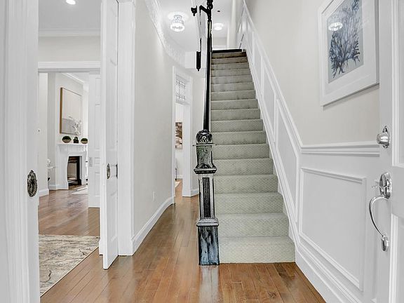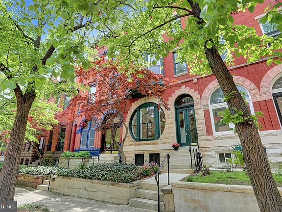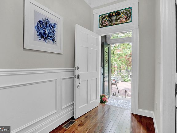 Welcome to this exceptional Bolton Hill property, where historic Baltimore charm meets modern luxury in the heart of the sought-after Bolton Hill neighborhood. This one-of-a-kind home blends grand 19th-century architecture with high-end contemporary finishes, creating a truly special place to call home. The distinctive façade is an instant showstopper, featuring original red brick paired with robust stonework and dramatic, oversized arched and circular windows. Lush front landscaping, mature trees, and an elevated entry with wrought-iron railings complete the picture, while the tree-lined street creates an inviting, walkable community atmosphere. Step inside to experience expansive living spaces adorned with tall ceilings, beautiful hardwood floors, and period millwork. The formal living and dining rooms flow gracefully together—ideal for entertaining—with historic mantels, tiled fireplaces, and classic pocket doors offering both character and flexibility. The kitchen is a chef’s dream, fully renovated with white shaker cabinetry, high-end stainless appliances, subway tile backsplash, and a custom wood range hood. A center island with quartz countertop is perfect for meal prep and casual dining. The second and third floors offer incredible versatility for modern living. The third-floor primary suite is a true retreat: spacious and sun-drenched, featuring a dramatic set of arched windows, a large walk-in closet/dressing room, and a spa-inspired bath with double vanities, a marble shower, and built-in bench seating. Secondary bedrooms are generously sized, bright, and include ample closet space. A charming bay window with a built-in bench in one bedroom offers the perfect reading nook overlooking the leafy street. Schedule your private showing today and discover the magic of Bolton Hill living!