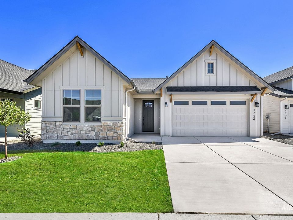 Glacier model located in the newest gated community in Star, offering resort-style amenities including pickleball courts, community pool, and scenic walking paths. This thoughtfully designed single-story home spans 2,064 sqft with 4 bedrooms and 2.5 baths. The gourmet kitchen is outfitted with upgraded Thermador appliances, quartz counters, a butlers pantry, and high-end finishes. Soaring 9-ft ceilings, an open floor plan, and adjacent dining and living areas make this home ideal for both entertaining and everyday living. Enjoy the covered patio, full landscaping with sprinklers, and a deep two-car garage. Modern elegance meets functionality seamlessly throughout this residence.