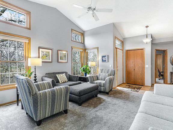 Looking for a townhome & a maintenance free lifestylebut concerned about the lack of privacy? Look no further.this end unit walkout rambler is located at the end of the neighborhood on a cul-de-sac & overlooks a wooded wetland! A+ location & Move in Condition make this a great opportunity! Main level w/ vaulted ceiling, beautiful windows, new carpet, updated kitchen w/ maple cabinets, quartz countertops & tile backsplash. Lovely bay window in the kitchen, six foot breakfast bar & hearth room finish off this amazing kitchen space. Main level living w/ vaulted owners suite, second bedroom/office option & Trek decking. Walkout lower level includes the third bedroom, full bath, huge storage room, spacious amusement room w/ fireplace & triple slider door to patio & wooded backyard. New roof. Quick close possible!