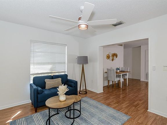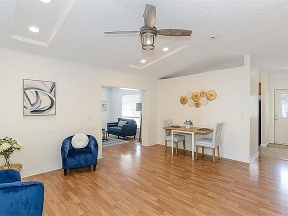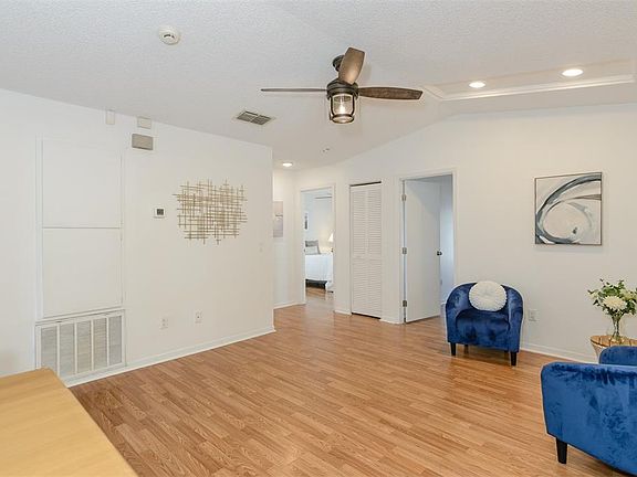 Step inside this inviting Clearwater home that blends comfort, warmth, and functionality. The split layout offers privacy between bedrooms, while the updated kitchen features stone countertops, solid wood cabinetry, and Whirlpool appliances that make daily living effortless. Luxury vinyl plank flooring extends through the kitchen and baths, complemented by updated lighting fixtures and ceiling fans in every bedroom. The primary suite includes double built-in closets, an en-suite bathroom, and sliding doors leading to the screened-in lanai overlooking the fenced backyard — a perfect spot to relax or enjoy morning coffee. The second bedroom also provides access to the patio, offering added versatility for guests or a home office. A flexible living area can serve as a family room, den, or creative space. Outside, you’ll find a cozy fire pit — perfect for relaxing or entertaining. The home includes a one-car garage for secure parking and extra storage. A large built-in storage closet, accessible from the backyard, provides a convenient space for tools, lawn equipment, and outdoor gear. Major updates include a 2018 AC system and 2018 water heater. Ideally located near the Long Center, Coachman Park, and just minutes from Downtown Clearwater, Downtown Dunedin, and Clearwater Beach, this home offers the perfect blend of comfort, convenience, and Florida’s vibrant coastal lifestyle.