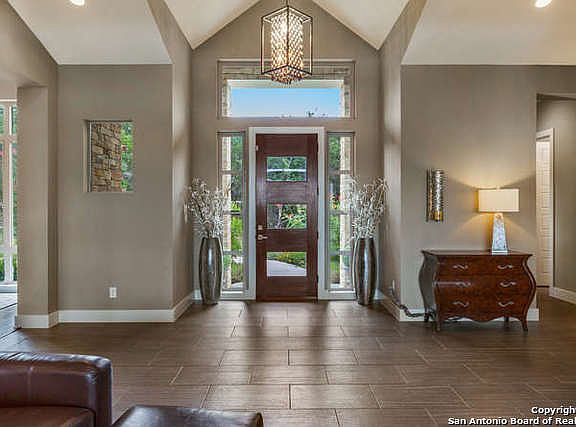 Resort-like home with pool/spa overlooking Government Canyon State Park! Floor to ceiling windows to enjoy the fabulous views & amazing sunsets. Open family room with fireplace; adjoining gourmet kitchen with Bosch appliances; oversized island, gas cooktop, built-in ice maker & wine refrigerator. Master bedroom with floor to ceiling windows has great views; boasts a floating ceiling with ceiling fan. Master bath with walk in shower, garden tub. Extended oversized garage for handling large Texas trucks!