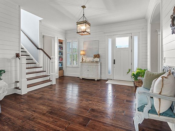 Waterfront 5 bed/4.5 bath home with views of the river from nearly every room in the house. A coastal retreat with a saltwater pool, hot tub & a finished lower level. Shiplap throughout, hickory floors, huge walk in pantry, a bunkroom, California closets, elevator shaft, two tankless hot water heaters, two laundry rooms, tons of closets & endless upgrades. Enjoy water views from the family room that offers a gas fireplace with white brick surround, full sized mantle and built in cabinetry. The kitchen is an epicurean's dream with custom cabinets, farmhouse sink, Jenn Air stainless steel appliances including a beverage center and massive island with grey cabinetry makes this home perfect for gatherings & entertaining. The main floor also includes a formal dining room, dual home officesone of which has water views. The beautiful master suite takes advantage of the river views, with vaulted ceilings, hickory hardwood floors, oversized tiled shower with marble seating, dual vanities with marble countertops and a deep jetted tub and beautiful fixtures. Each of the upstairs bedrooms take advantage of water views including the bunkroom which has 4 built in beds, a huge closet and Jack & Jill bath with Kohler trough sink. The upstairs laundry room has generous counter space for all of your laundry needs and custom cabinetry plus a gift wrapping area. The finished lower level is huge with over 1500 sq ft. with an oversized mudroom, a laundry room and lots of climate-controlled storage. The ground level offers a guest suite & game room with views of the pool and water. Enjoy the privacy of your backyard overlooking the saltwater pool, hot tub and endless water views. Dunes West is a guard gated community.