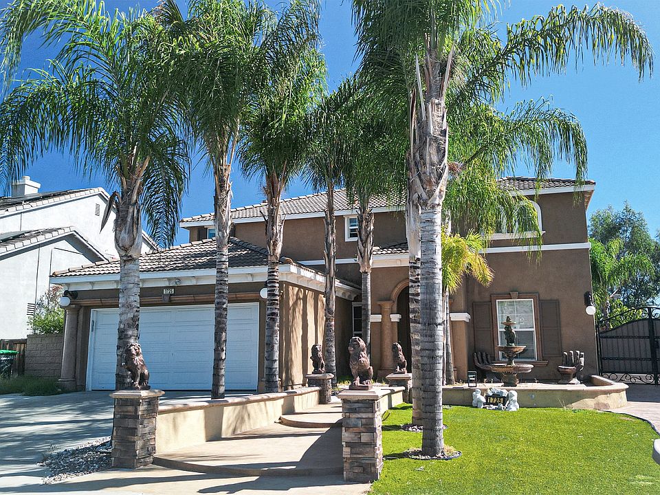 The home also includes a spacious garage, RV/boat parking, and a beautiful front yard with a water fountain, palm trees, and a cozy sitting area to relax and enjoy the view.