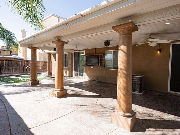 Outside, you'll find a true entertainer's dream: a sparkling pool with multiple water features including a waterfall, rain effect, dolphin fountains, and a jacuzzi. The covered backyard area is perfect for gatherings, featuring ceiling fans, a mist system for hot days, outdoor speakers, a mounted TV, and even a disco ball for lively nights!