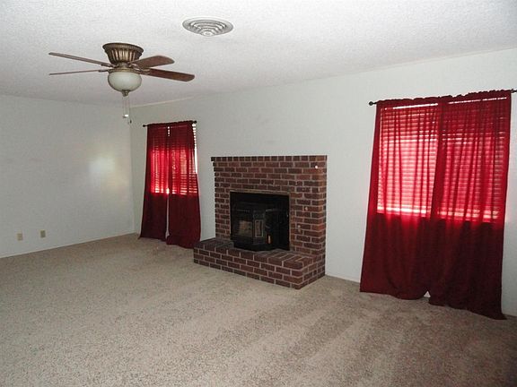 Picture cozy nights in front of the fireplace! The living room is at the rear of the home and the kitchen and dining up front. The tile floors are very nice and the carpeting was replaced in 2017! There are 2 sheds in the back yard and an under eave patio just out the French doors!