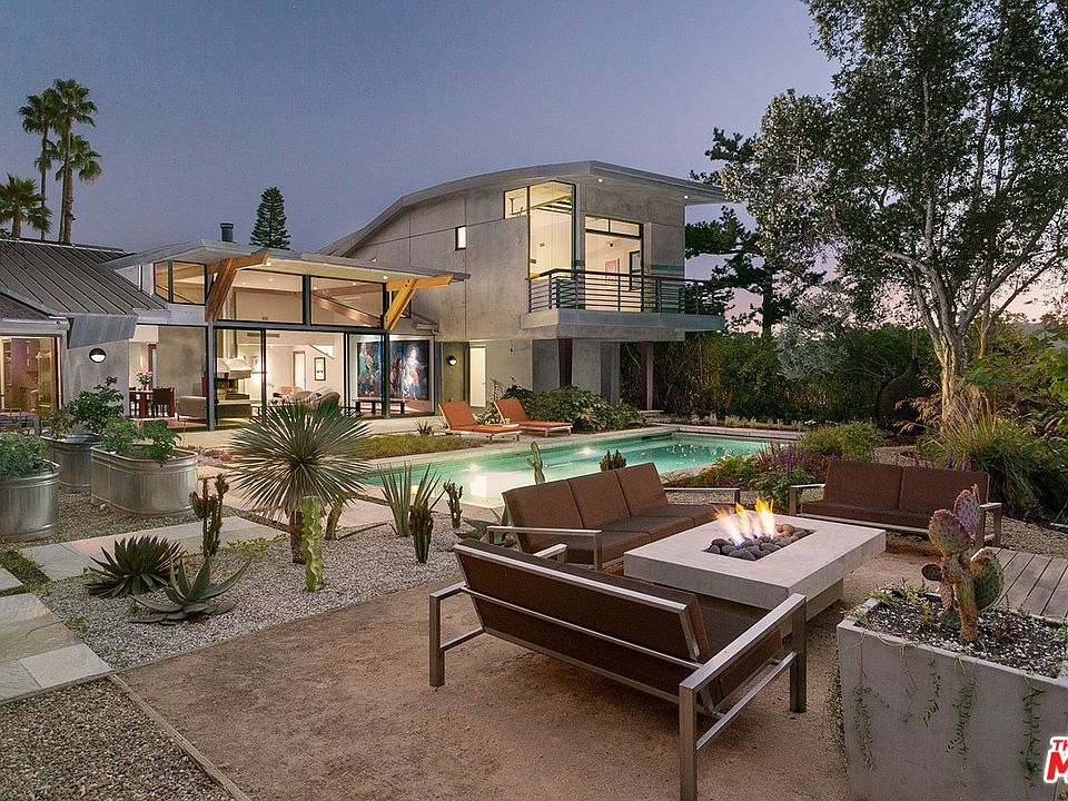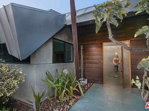 This steel troweled plaster, galvanized aluminum and glass home sits on a Benedict Canyon bluff. Designed by Frank Gehry protege Hagy Belzberg, the home offers privacy and serenity, with valley and mountain views. Gate and motor court lead to the entry of this vaulted, dynamic gallery for living, dining, art and entertaining - with Douglas fir beams and wide-plank Brazilian cherry floors. A commanding hearth anchors the space, while glass walls and sliders flow to the drought-tolerant gardens, pool, and fire pit conversation area.The spacious primary tree house suite occupies the entire second level and features a glass floor-to-ceiling roll-up door to the balcony, closet/dressing area, office nook and jetted tub with views of Century City. A chef's kitchen with breakfast banquette opens to an outdoor dining terrace and vegetable garden. Two additional bedrooms, two baths, den/media room, powder room, laundry, housekeeper's ensuite bedroom and two-car garage with electric car charger.