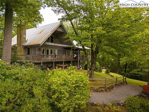 Just imagine stepping out of your home on a bright, sunny mountain morning and exploring any one of the numerous hiking trails that wind through 38+ acres of private, wooded land complete with ponds and springs. Afterward, relax by the firepit or on one of the large decks or balconies and continue enjoying your own private retreat. The main house has that great "mountain vibe" and features a spacious living room with vaulted tongue & groove ceilings and exposed beams, wood-burning stone fireplace and abundant windows. The open floorplan flows easily through the living, dining and kitchen areas. The primary bedroom suite is conveniently located on the main level. Upstairs, you will find a loft with two additional sleeping areas, another large bedroom with private deck and two full bathrooms. The lower level of the home has an additional sleeping area or "flex" space with half bath and laundry facilities. The is a large barn with plentiful farm equipment storage, workshop space and a bunkroom w/ full bath. Excellent parking and open, level rear yard space. This property is centrally located between Boone and Wilkesboro with easy access to 421. This property offers something for everyone and is a perfect place for your full time residence or those weekend getaways!!!