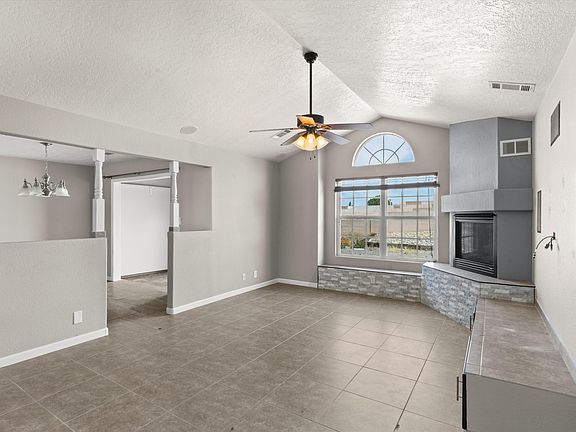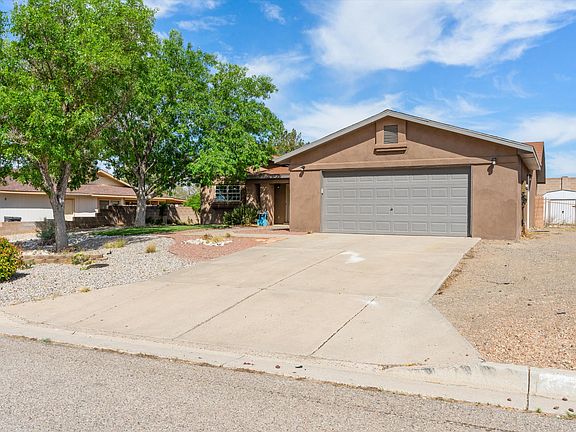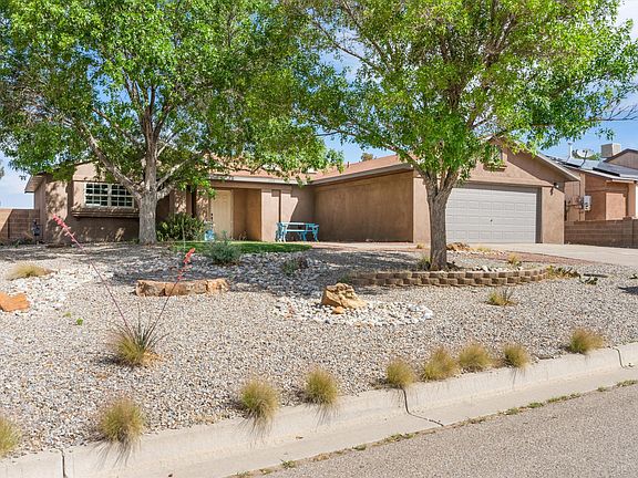 Welcome home!The only thing you will need to do is move in.This spacious, sun-filled single-story home with an open floorplan includes 3 bedrooms,2 full bath, tile&carpet flooring throughout, gas fire place, refrigerated air, water softener system & more!This cozy home has been fully remodeled in 2021 with NO poly pipes & offers plenty of space including an extra room in the garage (heated & cooled) that can be an office, craft room or large walk-in closet. A kitchen with granite counter top, stainless steel appliances & lots of cabinets. Master suite with a separate shower, jetted tub & a walk-in closet. Beautifully landscaped front yard with mature trees & huge backyard w/ RV access. Situated on a large lot in River's Edge with views of the Sandia mountains. Schedule your showing today!