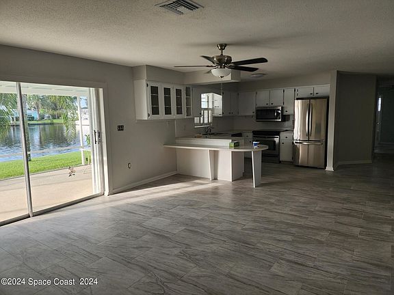 Beautiful view from the 160 feet of river front property. Updated home with three bedrooms, two baths, 2-car garage, screened patio, built-in hot tub. Freshy painted with new flooring, new appliances and there is a fireplace. Lawn service and spa service i included. Owner will consider pets.