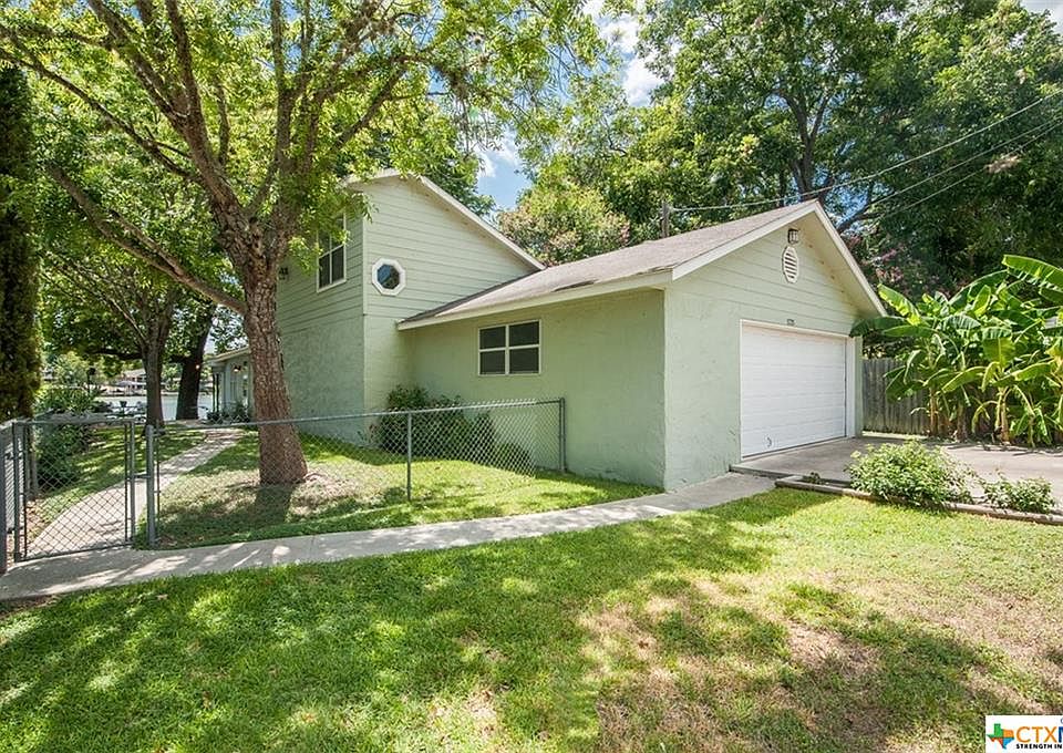 Lake McQueeney waterfront cottage on popular Terminal Loop Road. Great location with great views toward The Point and the back side of Treasure Island. 2 bedrooms, 1 bath downstairs with kitchen/dining, living and glassed in porch, 1 large bedroom and bathroom upstairs. 2 car garage attached. Boat house and dock with large sun deck shaded by a massive cypress tree. 1/2 acre lot across the street also conveys.