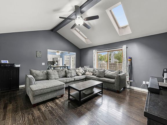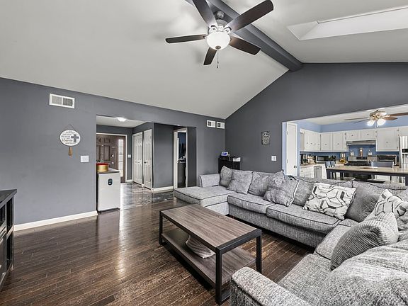 Beautiful ranch home, move-in ready! White trimwork, updated hardwood flooring and casement windows throughout! Dramatic vaulted, beamed living room with skylights and updated ceiling fan/light plus huge picture window. The bright kitchen has stainless steel appliances, lighted ceiling fan, TONS of white cabinets and bayed French door, flanked by windows, to the huge deck. The primary suite features dual windows, overhead fan/light fan and private bath. Spacious secondary bedrooms have terrific closet space and convenient access to the hall bath. Relax, unwind and entertain in the finished lower level rec room with huge wet bar! Additional room is perfect for play room, office or exercise. Unbelievable storage room with laundry! Escape to the outdoors on the large deck overlooking the private fully-fenced yard. Love where you live! Don't miss this one!
