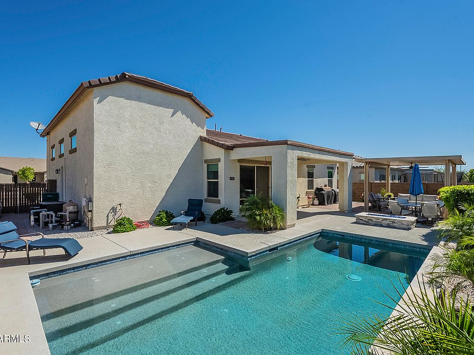 This home has it all and offers an open floorplan, wood-look tile throughout, neutral paint, & high ceilings. Kitchen features upgraded, soft close cabinets, corner hutch, quartz counters, pantry, SS appliances & coffee bar. Custom built entertainment center in living room w fire place mixes cozy & class. Master is split, features walk-in closet, en-suite w wheel chair friendly shower, dual sinks & quartz counters. Outside life through extended sliding glass doors to a complete resort style, all seasons backyard, including large covered patio, and secondary pergola space with gas firepit, sparkling pool w water feature, in-floor cleaning system, 2 heaters & cooling. RV garage upgraded w Polyaspartic floor, insulation, RO loop, automatic opener, 220 and 50 Amp, dump station & Split AC.