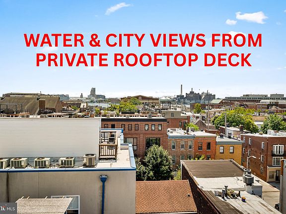A rarely available corner 2 bed, 2.5 bath penthouse condo in the heart of Fells Point with secure covered parking and a rooftop deck with sweeping views of the harbor and city skyline. Elevator in building! Open main level with hardwood floors, spacious living area, powder room and a Juliet balcony. 2 large bedrooms, each with their own bathroom, laundry, and stairwell access to rooftop deck. Primary comes with ample natural light, large ensuite bathroom and walk-in closet. The private rooftop deck will wow you with water and city skyline views. A perfect space to unwind after a busy day, hang out with friends and watch the fireworks on NYE and 4th of July. Gated parking lot with an assigned parking space for 1 car (#10) and community offers easy communication to use other resident spots when available for your guests. Live in an incredible building with a gated community courtyard complete with a grilling area, seating, Koi pond, elevator and secured parking. Located minutes from the iconic Thames Street in Fells Point, Harbor East, Canton, and Johns Hopkins. Easy access to I-95 and I-895. Steps to the waterfront, the newly renovated Broadway Market, Starbucks, Whole Foods, shops and some of the city's finest dining. Pet friendly. Immediately available! Please note: Rooftop deck is under construction for approx. the next 30-60 days.
