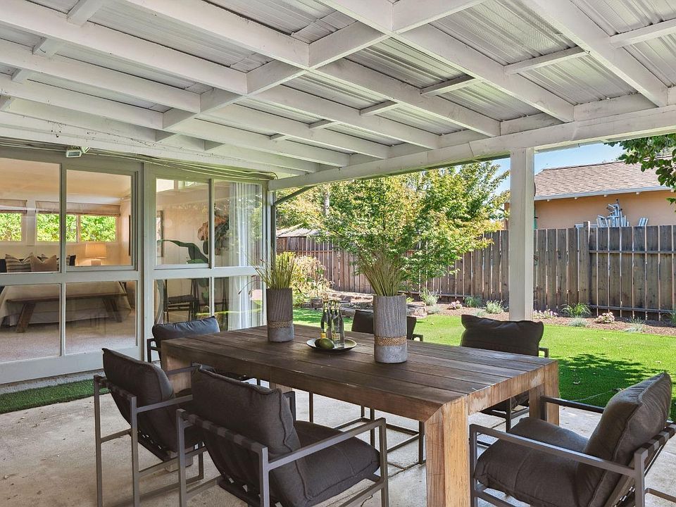 This charming single-level home, located just outside Downtown Novato, blends comfort, convenience, and style. The inviting open-concept design features a cozy living room anchored by a white brick fireplace, a sun-drenched formal dining room, and an updated kitchen. The kitchen boasts a spacious breakfast bar, ideal for casual dining or morning coffee, with double-French doors that open to the garden. The primary suite offers vaulted ceilings, an en-suite bathroom, and large windows overlooking the outdoor dining and garden area. Two additional bedrooms, both with raised ceilings, share a full bathroom and offer lovely views of the private backyard. Step outside to enjoy the expansive, fully fenced yard with a covered patioperfect for entertaining or relaxingsurrounded by lush gardens and level turf. Located just a short distance from Downtown Novato's vibrant shops, restaurants, and historic old town, this home also offers easy access to local parks, Highway 101, and public transportation.