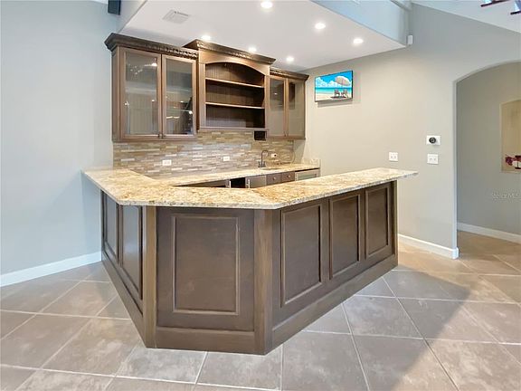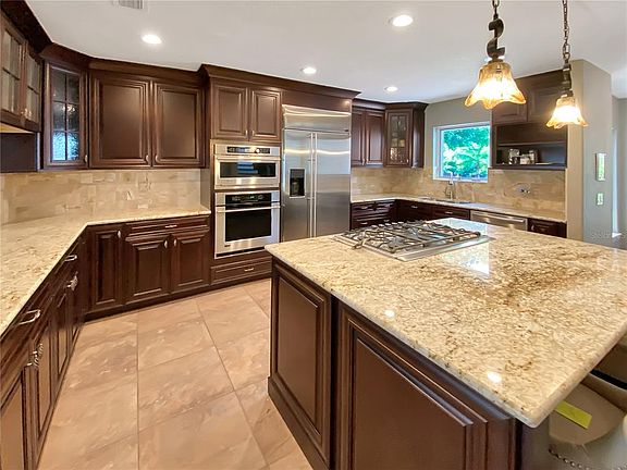 Welcome home to this beautiful Mediterranean masterpiece offering five bedrooms, five full baths, front and rear porch, along with a master balcony, overlooking a resort style pool and spa. This spacious, triple split plan with dual master suites offers the living room with wet bar, full bath and garage on ground level, the kitchen, dining room, one master suite and another bedroom with pool bath on the second level, and the master suite with family room and two more bedrooms and bath on the top level. The original home was constructed in 1950 with the main addition and upgrades taking place between 2002/2015. Quality finishes throughout including granite countertops, GE Monogram appliances, gas cooktop, Pella windows, hardwood floors, and wet bar with dual beverage coolers and ice maker perfect for entertaining. Travertine pavers surround the lush tropical pool built in 2005.