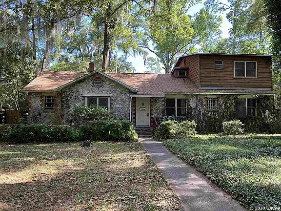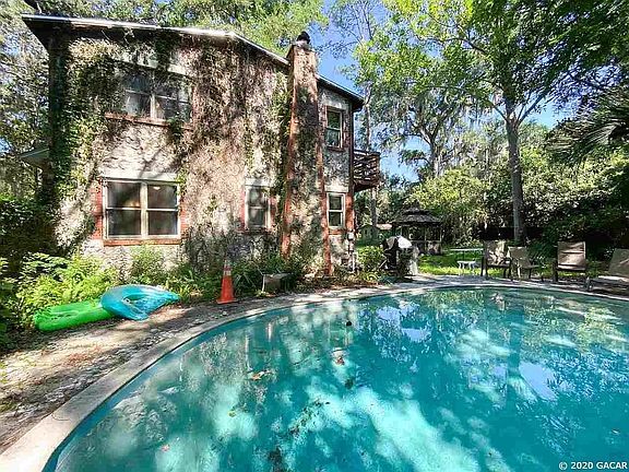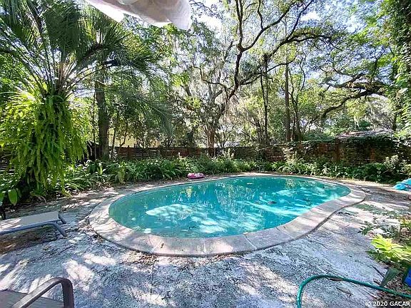 This beautiful 6 bedroom house with its aesthetically appealing Chert Stone fascade is located just 6 Blocks from UF! The distinctive Chert Stone was mined from local quarries. This spacious home is found on an equally spacious treed lot, .4 acres. The gated backyard is totally enclosed with a privacy fence and contains citrus trees, a pool, and an out building for laundry and storage. You'll fall in love with the many architectural details that make this house special like the wood floors, arched doorways, accented paneled ceilings, a stone fireplace, crown molding, and stained wood trim on windows and doors. Includes $200+/month pool maintenance, central A/C, off street parking, extermination, lawnmowing/landscaping, repair and maintenance included.
