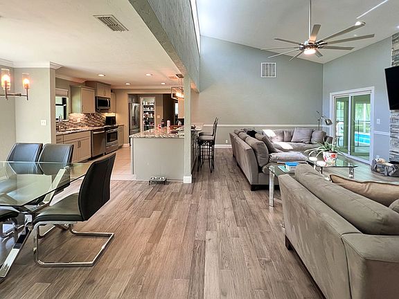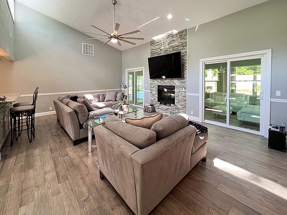 This is the one you've been waiting for! Absolutely stunningly remodeled 3-bedroom, 2-bathroom POOL home located in the desirable SW Gainesville neighborhood of Sunrise, boasting over 2,000 square feet! This home offers a perfect blend of comfort and style. As you step inside, you'll be greeted by a spacious and open concept living area, complete with a vaulted ceiling, tons of natural light, and double-sided fireplace - perfect for those cooler evenings! The kitchen is a chef's dream - complete with a breakfast bar, granite countertops, full stainless steel appliance package, wine cooler, walk-in pantry, and dining area. The primary suite offers views of the pool, a walk-in closet, walk-in shower with shower panel system, and water closet. The sunroom/flex space is the perfect addition, providing an abundance of natural light. Step outside and discover your own private oasis, featuring a sparkling pool - ideal for relaxing or entertaining. The outdoor fireplace and grill area complete with picnic table provide the perfect setting for enjoying al fresco dining and creating memories. The home also features two spacious guest rooms - one with a walk-in closet, guest bath, and a laundry room with stainless steel washer/dryer & utility sink. With a 2-car garage, you'll have plenty of space for parking and storage. Convenient access to a variety of amenities, including shopping, dining, and entertainment. Flexible lease terms available. Don't miss out on this one! Contact us today to schedule a viewing!!