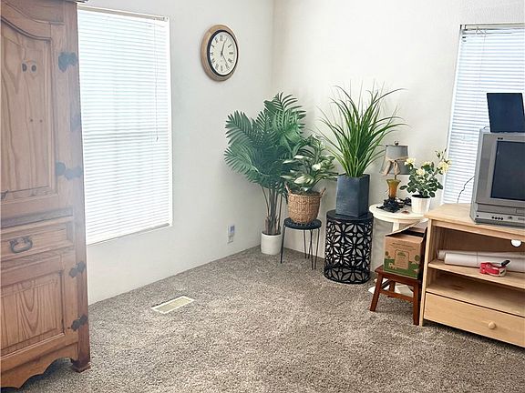 Bright and welcoming home featuring an open living and dining area with abundant natural light. Spacious kitchen offers plenty of cabinet space and tile flooring. Charming exterior with shutters and greenery. A comfortable, move-in-ready space in a great park!