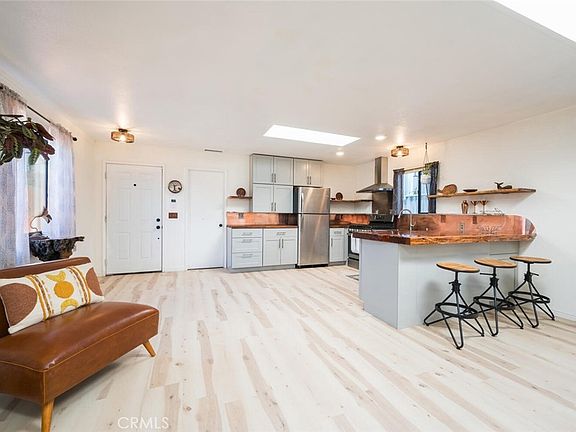 Beautifully remodeled coastal retreat in a peaceful Los Osos neighborhood! Bathed in natural light, this home showcases artisan updates throughout. Recent upgrades include a new roof, fresh interior and exterior paint, luxury vinyl plank flooring, and updated kitchen and bath. The kitchen features a striking redwood live-edge bar top, stainless counters and shelving with copper accents, plus new cabinets and appliances. The living room is highlighted by a custom hammered-copper fireplace surround with a live-edge mantel.