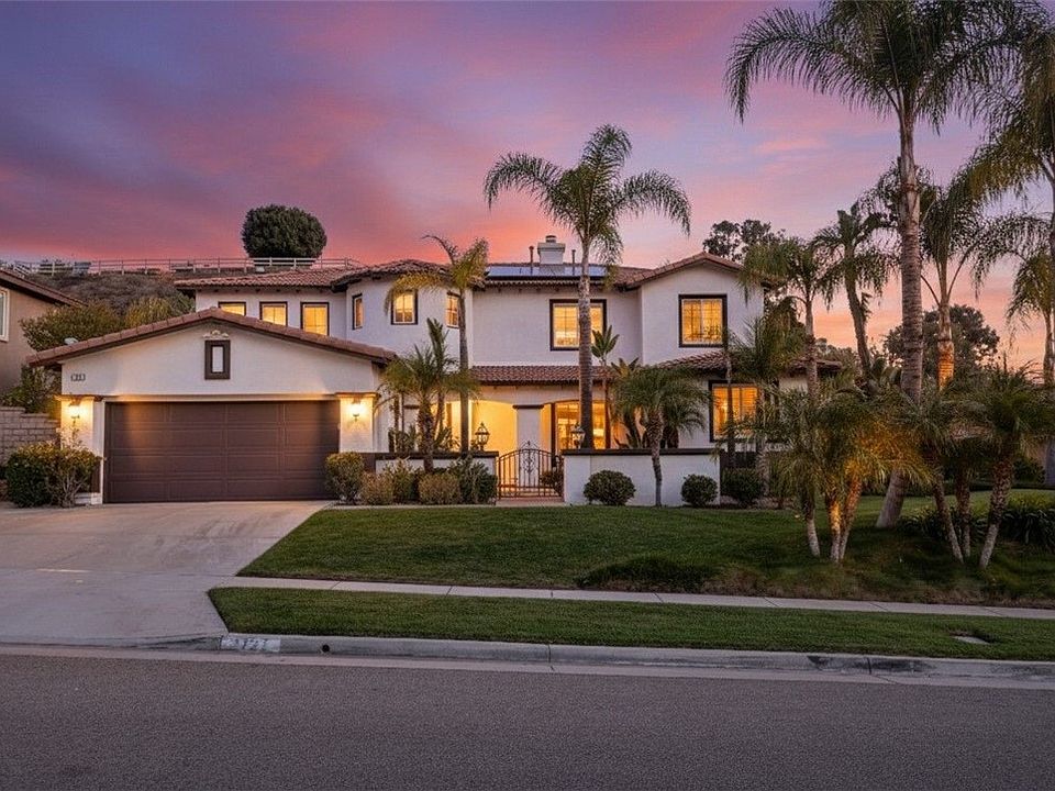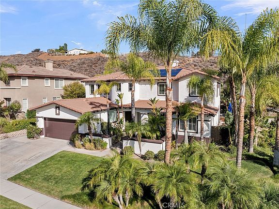 Beautifully upgraded home located in the highly desirable Eagle Glen community. This spacious residence features a large entry living room with vaulted ceilings and abundant natural light. The formal dining room is conveniently located off the kitchen, perfect for entertaining. The chef’s kitchen offers an oversized center island, ample counter space, and opens to the family room complete with a cozy fireplace. Downstairs includes a bedroom and full bathroom, oversized office, and laundry room for added convenience. Upstairs features three guest bedrooms, including one with an en-suite bathroom, plus an additional guest bath. The primary suite is light and bright, offering a luxurious en-suite bathroom with dual sinks, walk-in shower, center soaking tub, and walk-in closet. Enjoy resort-style living in the private backyard oasis, featuring a rock pool with waterfall, grotto-style spa, and palapa-covered patio—perfect for entertaining or relaxing. Additional highlights include a solar system, two-car garage, and a prime location near the 15 freeway, Fastrak entrance, schools, shopping, and dining.