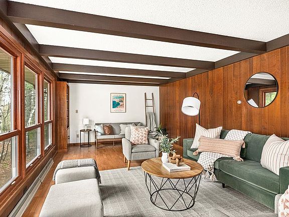 Discover this architecturally striking mid-century modern ranch at 1727 North Road, an inviting retreat that oozes vintage charm and offers remarkable privacy and space. Nestled on nearly three wooded acres at the end of a quiet Kenwood cul-de-sac, this expansive 4+ bedroom showpiece immediately impresses with its grand foyer and abundant storage for every season. Step inside and experience soaring formal living spaces, highlighted by a remarkable floor-to-ceiling window wall that floods the interior with natural light, uplifting your spirits and providing picturesque views of the lush grounds. A warm and cozy family room awaits nearby, anchored by a classic wood-burning fireplace, perfect for gatherings on crisp evenings. Sliding glass doors invite you onto the deck, revealing a private backyard framed by majestic maple, birch, apple, and oak trees, a sanctuary for year-round enjoyment and seasonal color. The heart of the home is a chef-ready kitchen, featuring generous countertops, custom cabinetry, and an oversized pantry to satisfy every culinary whim. Wander down the hallway to find three comfortable bedrooms and a full bath, thoughtfully separated for quiet and privacy. Downstairs, the bright and versatile lower level features a spacious recreation room with a gas fireplace and bar, perfect for game nights, movie marathons, or entertaining visiting guests. This versatile space can be transformed to suit your needs. Another bedroom, a convenient bath, a mudroom, and immense storage complete this flexible floor plan, while a rare tuck-under garage and a separate outbuilding ensure room for every vehicle, hobby, or adventure. Step outside to discover a backyard oasis, complete with a gentle stream and ample space to garden, play, or relax under the shade of a mature tree canopy. Despite the serene setting, you’re just minutes from all the urban conveniences, shops, restaurants, acclaimed schools, and the trails of Hartley Nature Center. Don’t miss your chance to embrace timeless style, modern comfort, and extraordinary property, all in one breathtaking Kenwood address.