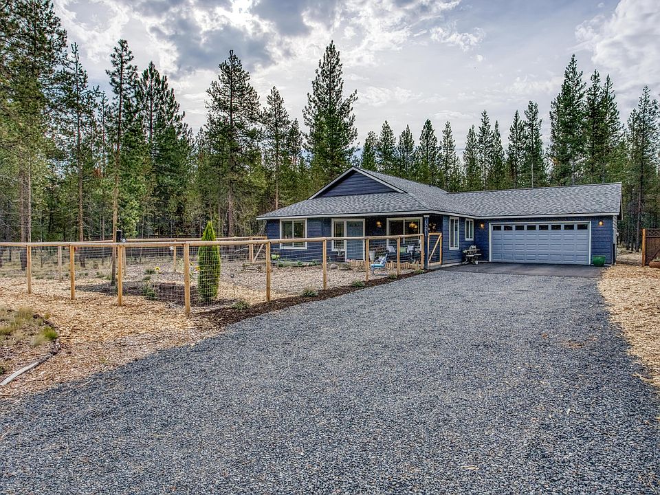 Built in 2021, this 3 bedroom 2 bathroom home is close to the Deschutes River, and sits on a quiet cul-de-sac just south of Sunriver. It's an easy drive to Bend, Mt. Bachelor and all the outdoor activities in Central Oregon! Fantastic primary home, would be a great investment property as well. Just under an acre, the property has a fenced front yard with low maintenance landscaping and natural woods around the sides and back. 1248 sf with an open concept kitchen, dining room and living room. Interior is in pristine condition, with plenty of natural light. Quartz counters in kitchen and bathrooms. Primary suite, guest bedroom and guest bathroom down one hallway, third bedroom down second hallway and laundry room leads into 2 car garage. Covered front porch for enjoying peaceful mornings, and a new trex deck in the back offers plenty of outdoor living space. 20x20 asphalt driveway pad and plenty of room for RV, boat, and more!
