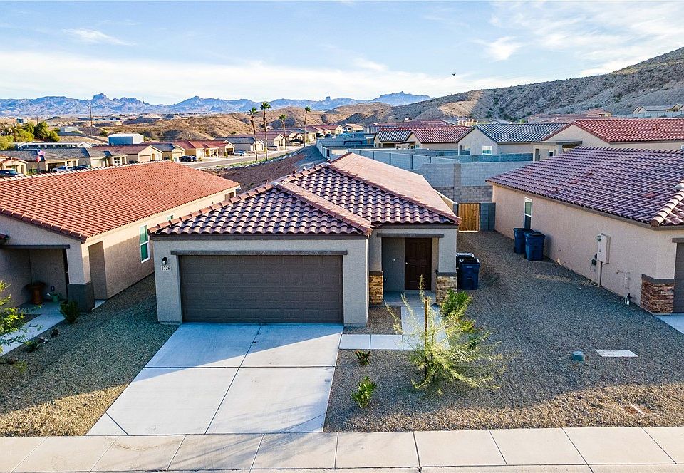 Nestled at 1728 Del Parado, Bullhead City, Arizona, this single-family residence offers an attractive proposition within a desirable residential area. The property presents itself in better than new condition, ready to welcome its new owners. The heart of this home resides in its open floor plan, where the kitchen seamlessly integrates with the living space. Imagine preparing meals on granite countertops, with plenty of cabinets to store all your cooking equipment, all while engaging with loved ones seated at the kitchen bar or gathered around the kitchen peninsula. The primary bedroom is a private retreat, boasting an ensuite bathroom designed for relaxation and convenience. Envision starting your day in this spa-like space, featuring a double vanity and a walk-in shower, providing a refreshing and invigorating experience. Beyond the interiors, the fenced backyard offers a private oasis for relaxation or entertainment. Step onto the patio and envision hosting gatherings, enjoying quiet moments, or simply soaking in the Arizona sunshine. The tiled roof adds a touch of elegance and durability to the home's exterior, while the laundry room provides a dedicated space for household tasks. From the property, enjoy a beautiful mountain view. This single-family residence offers a harmonious blend of comfort, style, and functionality, presenting an exceptional opportunity to embrace the Desert lifestyle.