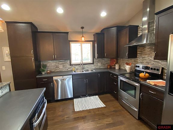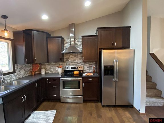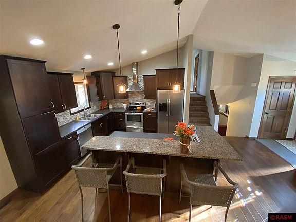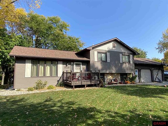 Agent is owner. This beautiful, completely renovated (2016) side-to-side 4 level split home sits on a heavily wooded, .58 acre, cul-de-sac lot. and has panoramic views and many areas to enjoy nature and entertain! This open floor plan with gorgeous espresso kitchen cabinetry has upgraded stainless appliances (drawer microwave in island, stainless exhaust hood, and convection oven, Bosch dishwasher), breakfast bar with quartz countertop, pantry, and espresso hardwood flooring. The vaulted great room has a newer contemporary gas fireplace, formal/informal dining areas and overlooks a wonderful knotty pine 4 season porch that has access to private patio. The sunny living area has a south facing vista and custom espresso bench, cubby organizer that transitions into a ceramic front entry and roomy closet. The upper level boasts a beautiful master bedroom with espresso hand-scraped flooring, dual closets and a cozy deck access (doubles as a fire-escape) for that morning cup of coffee! 3 bedrooms on upper level as well as a convenient partitioned bath with dual sinks, tile flooring, espresso cabinetry and quartz counter-tops. One level down from the main level is family room with a brick wood-burning fireplace and stairs access to garage, laundry and 1/2 bath. The fourth level features a multi-purpose family room with an egress window that could be used as a den, exercise room or media room and has a large closet. One last bedroom and 3/4 ceramic bath finish this multi-functional home. The XL insulated 2 stall garage also has a storage shed accessible from its back utility entrance. Lots of room for a work bench and storage. The front of the home touts newer vinyl siding, deck, garage doors. This home has been renovated from top to bottom in 2016, including new plumbing fixtures, flooring, cabinetry, appliances and light fixtures/fans. New AC in 2018, new water softener 2017. This home has a current rental license for the city of North Mankato, paid through 2021. Please view MLS documents to see comprehensive list of renovation improvements.