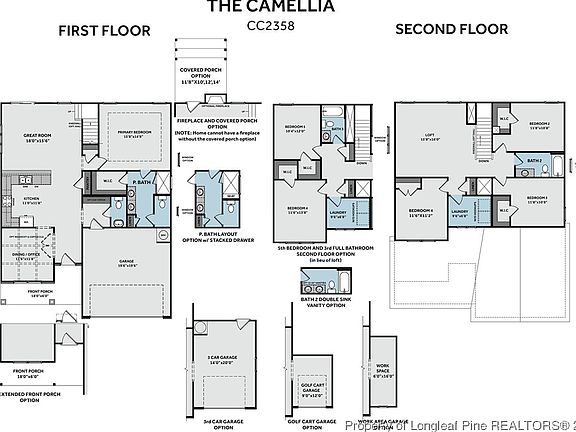 Camellia CC2358 "F" 4BR/2.5BA Energy Plus Home with 2358SF! Flex Room/Formal dining room off of the foyer. Kitchen with quartz countertops and stainless steel appliances (gas range, microwave over range & dishwasher), plenty of countertop space with sink overlooking Great Room. Bar seating. Pantry. Great Room with ceiling fan, gas log fireplace and access to rear covered porch. Half Bath. Main level spacious Primary Bedroom with trey ceiling and ceiling fan. Primary bathroom features large walk-in closet, private water closet, linen closet, quartz countertops with double vanity sinks and large shower. Laundry area on main level with stackable washer/dryer. Upper Level Features: Large Loft, 3 additional bedrooms, Full hall bath with tub/shower combination. Laundry room and linen closet. Security System. Professional Landscaping. 2 car garage. Community Pool House, Pool & Playground.