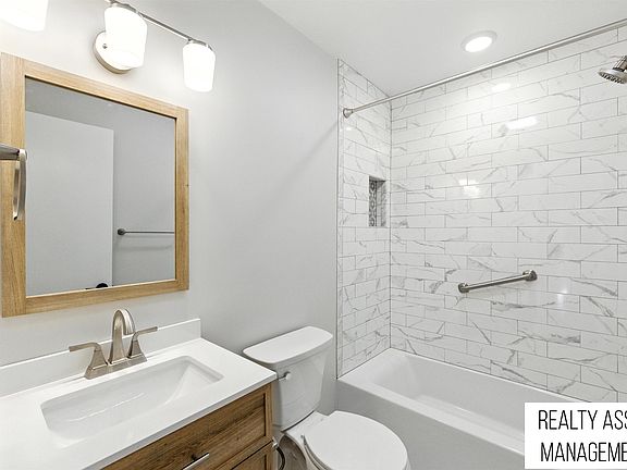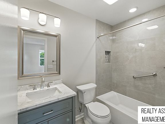 Patio sliding doorEnergy efficient new windowsLaminate plank flooringDramatic vaulted ceilingQuartz countertopsNew vanitiesCeramic tile