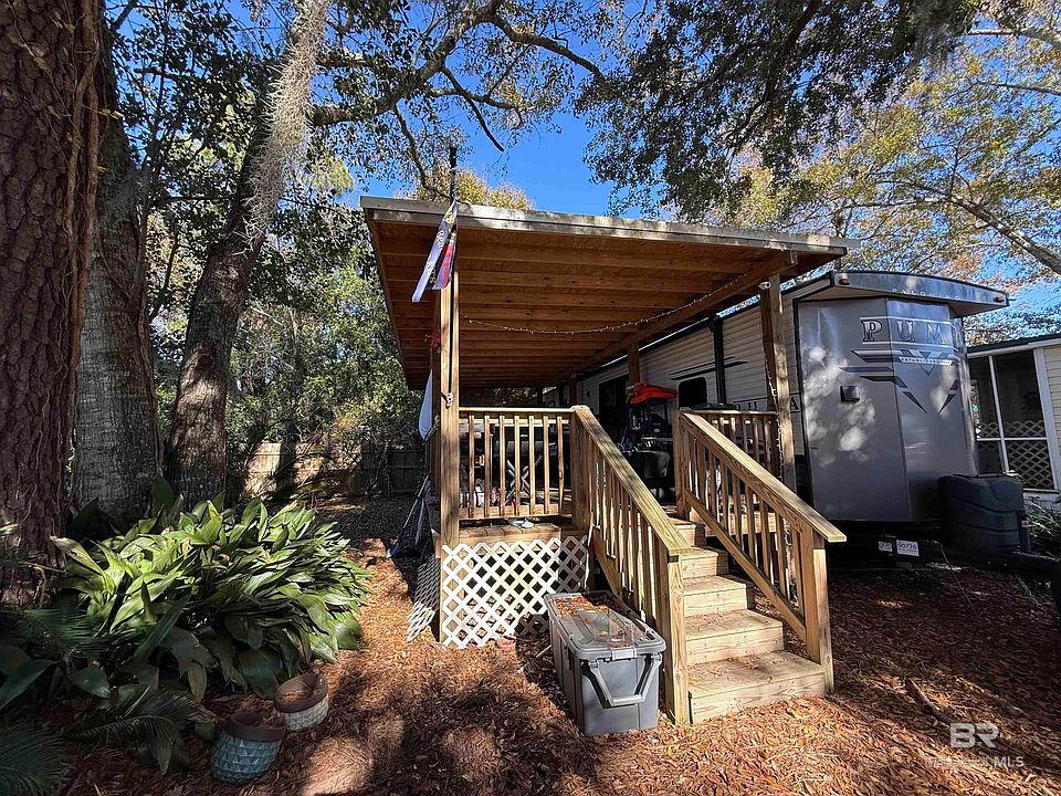 This is a Coming Soon Listing. STUNNING SUNSET VIEWS OVER THE WATER RIGHT FROM YOUR PORCH! Not your normal RV lot and lots in this subdivision don't come up often! Move-in ready with direct views of the Bon Secour River from the spacious 30' x 14' covered deck. This property features a 2021 Puma RV (approx. 450 sq. ft. living area) offering 2 bedrooms and 1.5 baths, positioned on one of the most desirable lots—Lot 12 on Pirate Circle. Added space to allow for 8 guests. The 108' x 38' lot showcases mature palms, live oaks, and fruit trees, plus 50-amp service, city utilities, and garbage service. Ideal for weekend escapes or investment use, with both short-term and long-term rentals permitted. Located half a mile from the new $4M public boat launch at County Road 6 and just 6 miles from Gulf Shores Public Beach. Vacant and easy to show today. Buyer to verify all information during due diligence.