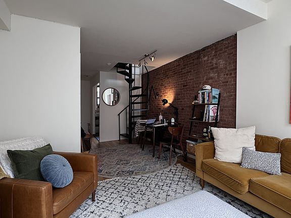 Overhead loft storageExposed brick wallsSpiral staircaseRoof deckLarge closetHardwood floorsWindowed kitchen