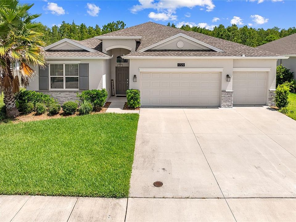 Beautiful FOUR bedroom THREE bath home featuring a THREE car garage on a 0.21 acre conservation lot. The yard is big enough to put in a pool should you desire to do so. This home has a 3 way split for added privacy with one bedroom and bathroom together as a great guest quarters, this bedroom also has a walk in closet. The home features ceramic tile plank flooring throughout with exception to the bedrooms which all have carpet. The floor plan has a formal dining room separate from the kitchen/living and breakfast nook great room concept. The kitchen features a closet pantry, breakfast bar, breakfast nook, 42" upper cabinets with crown molding, quartz counters, back splash and an island. The master suite comes complete with HIS and HERS walk in closets, a huge walk in shower, dual sinks, water closet and quartz counters. All of the bedrooms ceiling fans. Other great features in this home include a fenced back yard, security system, all appliances included, screen enclosed 8 x 18 Lanai, pocket sliding glass doors, multiple linen closets, a coat and vacuum closet, cabinets in the laundry room, a water softener system, and a home warranty through Warranty Service Plus good through 2/7/29. Seller is offering OWNER FINAINCING with 20% down, 7.5% interest rate with a 3 year Balloon. The neighborhood features sidewalks, a playground and community pool. Schedule a visit soon!