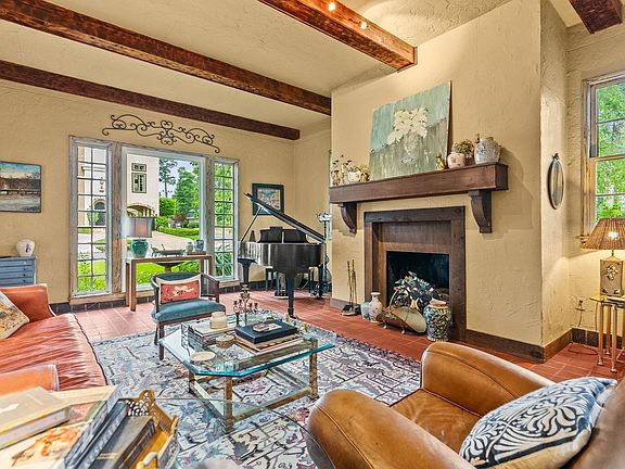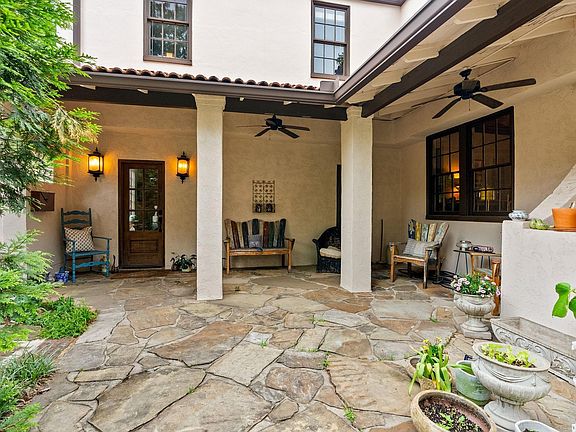 One of the most fun, architecturally pleasing homes you will see! Tons of amazing touches all throughout this updated, iconic 1926 Max Mayer home. A large formal room with a fireplace, tall ceilings, & a gorgeous detailed front window welcomes you into the home. The updated kitchen has wonderful appliances, solid surface counter tops, double wall ovens & a large farm sink. The kitchen is open to the sunken den with beamed ceiling and a wall of back windows overlooks an exterior dining patio with fireplace. The family room has plenty of space for a casual dining table as well another fireplace. The primary suite is on the main level and has a huge closet and very nice bathroom with double vanities, walk in shower and tub. There are back stairs that take you to a 5th bedroom or office (this space has a full bath and large closet). Off of the hallway to the primary is the entrance to the walled courtyard which is perfect for pet or child play. Also on the main level is a formal dining room and an office with a half bath. The main upstairs has 3 bedrooms with 2 full bath. Three of the four HVAC have been replaced since 2023. This is an exquisite, special home!! Come see!