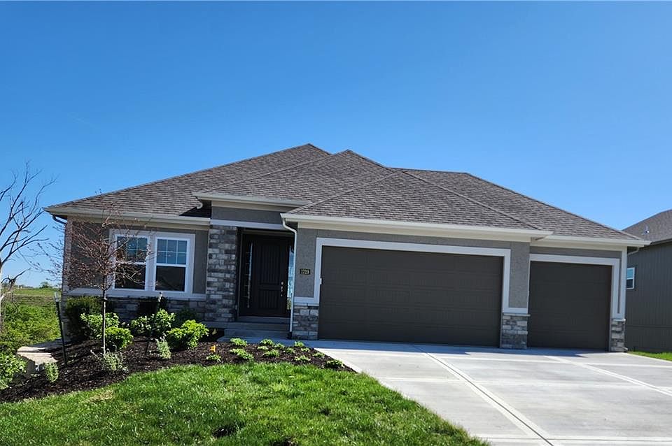 Resize your living space with and enjoy the benefits of maintenance provided living in the Truman by Patriot Homes! Located on a cul-de-sac homesite backing to trees, this reverse 1.5-story open concept plan includes a stone-clad traditional façade, 3-car garage and covered front porch. The 8-foot front door leads into a spacious entry with a 12-foot ceiling highlighted by elegant trim treatment & chandelier. Hardwood flooring throughout the main entry, living & kitchen accentuates the seamless flow between the dining, kitchen, and great room while a bedroom and full bathroom just off the entry makes for an ideal guest or bonus room. Arguably the showpiece of the home, the kitchen is outfitted with expansive quartz countertops, large center island, shaker style custom cabinetry, & stainless steel Samsung appliances. Opposite the kitchen is a cozy great room with a gas fireplace, built-in bookshelves, floor-to-ceiling windows and an 8-foot sliding glass door that opens to a covered composite deck. A private hallway leads to the master suite showcasing an exquisite soaker tub surrounded by granite decking, zero entry walk-in shower, Bluetooth audio system, and a sizeable walk-in closet with third tier pull down rods. The lower level offers a setting ideal for entertaining with a generously sized family room, gas fireplace, wet bar, and walkout access to a covered concrete patio as well as 2 secondary bedrooms, a full bathroom, and 2 unfinished areas for ample storage. The Truman comes equipped with additional conveniences such as 8-foot tall garage doors with an included belt drive opener on main door, an irrigation system, high efficiency 93% Lennox furnace, whole house humidifier, and 50-gallon electric water heater. **This home is under construction. Photos and virtual tour are simulated and of another completed home. Colors, finishes, features, and/or building materials in the actual home may vary from those shown.** Taxes, Lot size & sq footage are approximate.