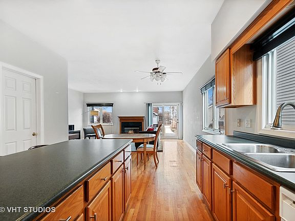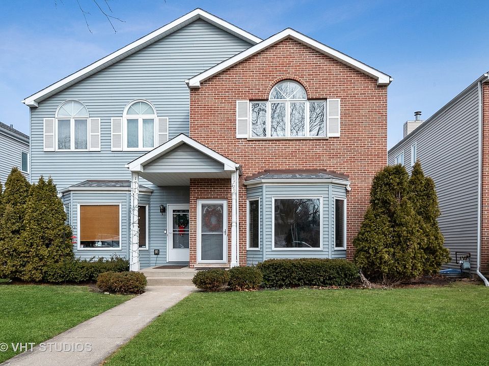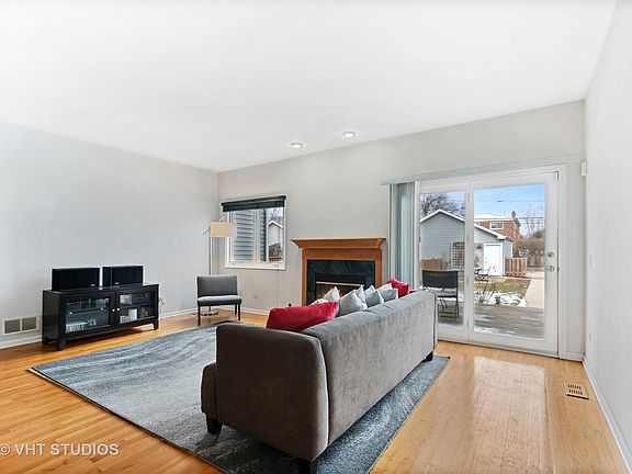 Spacious, bright townhouse that lives like a single family home. Sunny living room and separate family room with cozy fireplace open to large kitchen with island. Large glass door leads to the perfect deck and fully fenced, grassy backyard- the homeowner's association takes care of the yard work! Powder room right off the kitchen. Upstairs are 2 beds with hall bath and full primary suite with vaulted ceiling. Primary bath with double sinks, jetted tub and separate shower. Full, finished basement with egress windows for laundry, extra storage and play space. Detached 1 car garage with plenty of room for bikes and 1 parking spot included. Walk to Washington School and Robert Crown center. In great condition, but being sold as-is.