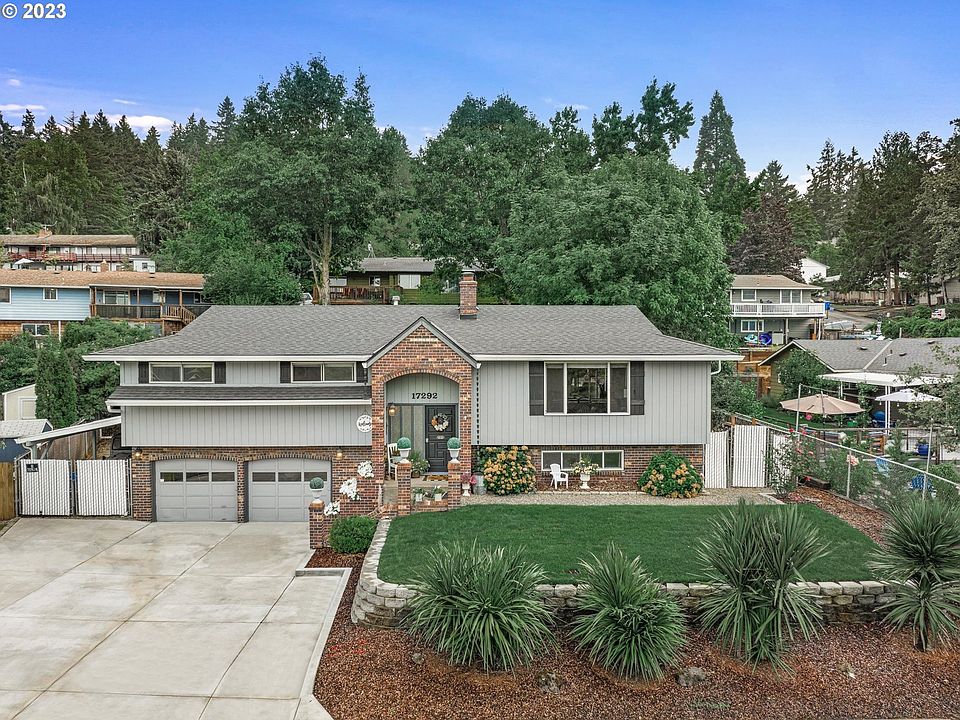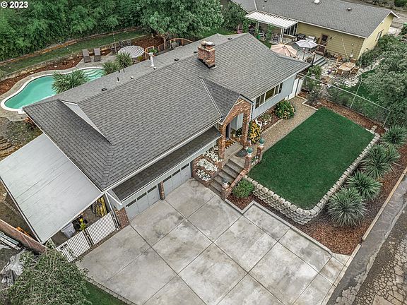 Stylish split-entry home featuring recent modern farmhouse upgrades (2023). Upgrades to home include new laminate flooring, refined trim details, a recently renewed kitchen featuring quartz countertops, soft-close cabinets, a farmhouse sink, and stainless steel appliances, including a double oven. Main-level bathrooms equipped with built-in Bluetooth speaker in lighting and fan systems. New roof/gutters, A/C unit, and furnace (2020). The property has tiered landscape, a freshly resurfaced pool (2022), heated in-ground pool surrounded by a sun patio and expansive deck. Additionally, there's a garden shed and a fenced area, perfect for a chicken coop or a small dog run. Lean-to behind gate large enough for boat or small trailer. This cul-de-sac home is located only 2 blocks from Rex Putnam High School and only a few minutes drive to restaurants, retail shopping, bus lines and services.