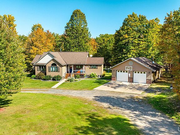 You’ll fall in love with this beautiful 3-bedroom, 2.5-bath home tucked away on 10 wooded acres in a sought-after location—peaceful country living just minutes from town! The property is absolutely immaculate with fantastic landscaping, mature perennials, and great curb appeal. A large front yard and circle driveway lead to this beautiful contemporary ranch home and a oversized 28x36 finished garage with concrete skirting, walkway, and a covered front porch featuring low-maintenance composite decking. Step inside to an open-concept kitchen, dining, and living area with vaulted ceilings and solid oak hardwood floors throughout. Natural light fills the space, and the gas fireplace with custom cabinetry and shelving adds the perfect cozy touch. French doors off the living room lead to a 24x16 deck overlooking the peaceful backyard—great for relaxing or entertaining. The kitchen is a dream—loaded with white painted maple cabinetry, a prep island with sink, gas range, solid-surface and black walnut countertops, white subway tile backsplash, and recessed lighting. The master bedroom features a vaulted ceiling, hardwood floors, and a large 8.7x6 walk-in closet. The newly renovated master bath is stunning—pocket door entry, double vanity with soft-close cabinetry, solid-surface countertop, marble-style ceramic tile, and a huge walk-in tile shower. Two additional bedrooms and a full bath are also located on the main level, along with a conveniently placed laundry area. The full basement is finished with zoned in-floor heat, offering plenty of extra space for a family room, home office, or entertaining. It even includes a bar area (sink not currently plumbed) and a walk-out exit to the backyard. The garage is a showstopper itself—insulated, drywalled, with a metal ceiling, workbenches, and a wood-burning stove—a true man cave! An attached 12x20 garage with lean-too provides perfect storage for lawn equipment and firewood. Located on a quiet country road with direct ATV trail access, this property truly has it all—comfort, privacy, and convenience!