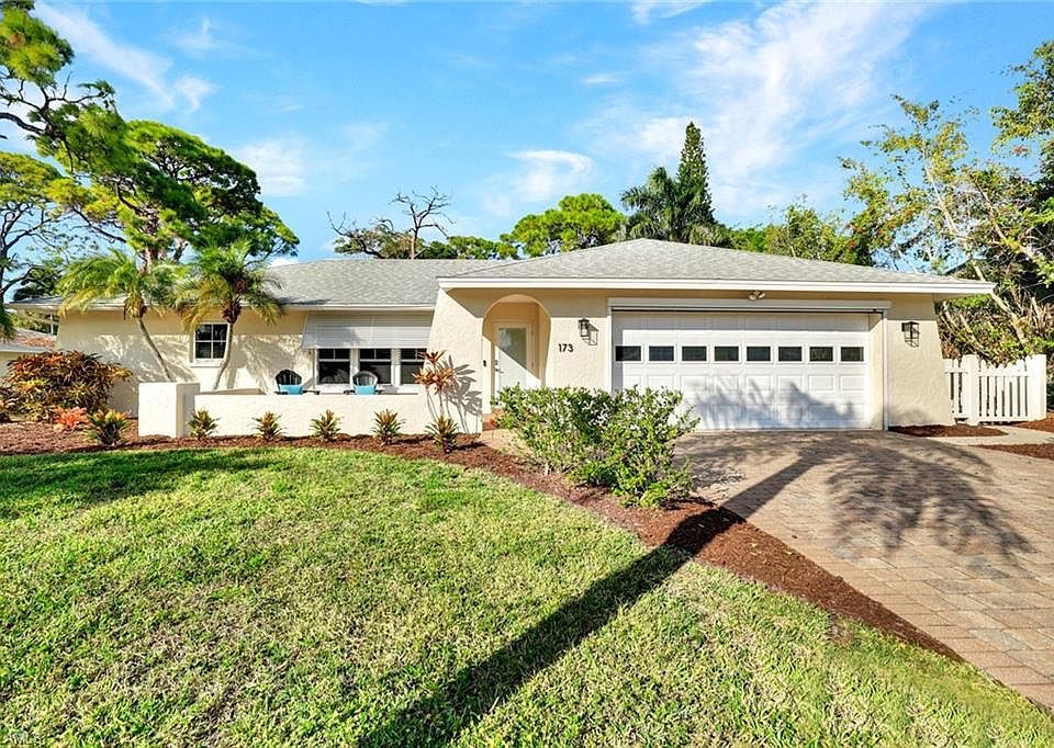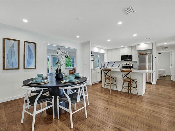 Fabulous opportunity to own a move-in-ready home in Bonita Shores, 1.2 miles from Bonita Beach. A community west of 41 in the NW corner of Collier County. You can also walk or ride bikes to Barefoot Beach or top-rated local restaurants and bars. This community has no HOA fees or rental restrictions, and the home has the ability to join the Bonita Shores Boat Ramp club for a small annual fee, providing gulf access and no bridges. Large, sprawling ranch with 3 bedrooms plus a den and a formal living room plus a bonus family room. This house checks off all the boxes. Currently furnished to sleep 10. Huge fenced-in backyard entertainment area and an outdoor enclosed 3rd shower (2 indoor and one outdoor). The beautifully remodeled kitchen boasts new cabinets and quartz countertops, bathrooms with tiled showers, wood-look ceramic tile floors, and a large 2-car garage. The family room has a pull-out queen sofa bed, and the office is fitted with a queen bed as well. This home would make a fantastic seasonal rental.