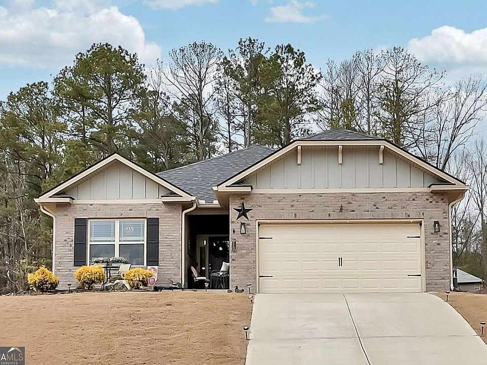 Welcome to "The Hilltop" - Spectacular Sunset & Open Sky Views! Commanding a dramatic hilltop position in Bramlett Ridge, this stunning 3-bedroom, 2-bath Craftsman-style ranch delivers breathtaking sunset views and endless open skies that will captivate you every evening. Built in 2022 - better than new - lovingly upgraded, "The Hilltop" lives up to its name - a private hilltop retreat on nearly half an acre of wooded serenity. The dramatic hilltop setting, accessed by a private ascending driveway, ensures unmatched privacy and those coveted panoramic views. Watch golden sunsets paint the sky from your covered back patio, or enjoy the peaceful wooded surroundings that make this property feel like your own private nature preserve. Inside, an open-concept floor plan is bathed in natural light. Luxury vinyl flooring flows through the living, kitchen, and dining areas. The chef-inspired kitchen features stainless steel appliances, elegant black granite countertops, stylish tile backsplash, and an oversized dining area made for gathering. The spacious primary suite boasts a generous walk-in closet and spa-like en-suite with tile flooring, double vanity with quartz countertops, separate soaking tub, and walk-in shower. Fitness enthusiasts will love the high-end home gym in the spacious insulated 2-car garage with an insulated garage door - no membership required! Work out on your schedule in your own private fitness space. (Equipment not included but open for an offer or garage can be converted back to a garage.) Make it yours. Move in ready. Premium Upgrades Include: Granite Counters 5 Piece Master Bathroom Detailed trim Whole-home KDF water filtration system Under-sink reverse osmosis filter Heavy-duty metal attic stairs Upgraded ceiling fans & lighting throughout New high-capacity septic system Smart garage door opener High-end home gym in garage Samsung Smart Fridge & GE Washer/Dryer INCLUDED The covered back patio with ceiling fan overlooks a huge, wooded, private backyard - your own outdoor sanctuary for relaxing or entertaining under the open sky. For Buyers! By partnering with our trusted mortgage professional, buyers may receive up to 1% in lender credit (based on the loan amount) and may also be eligible for a 1-0 lender-paid buy-down.