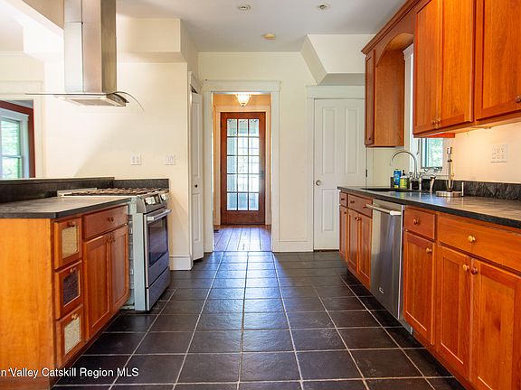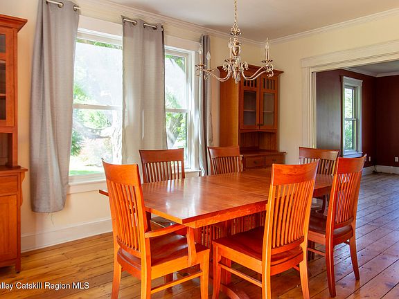 1892 Colonial thoughtfully renovated with hand crafted cherry kitchen. High ceilings, and large windows. Wood floors. Original detail. Three good sized bedrooms. Full attic finished off with plumbing ready for another bath. Wonderful location with private yard. Two car garage. Level land and seasonal stream. Walk to the village.