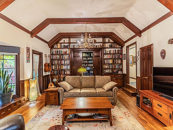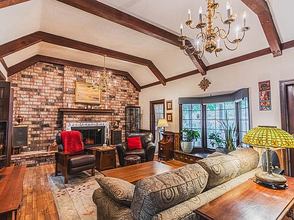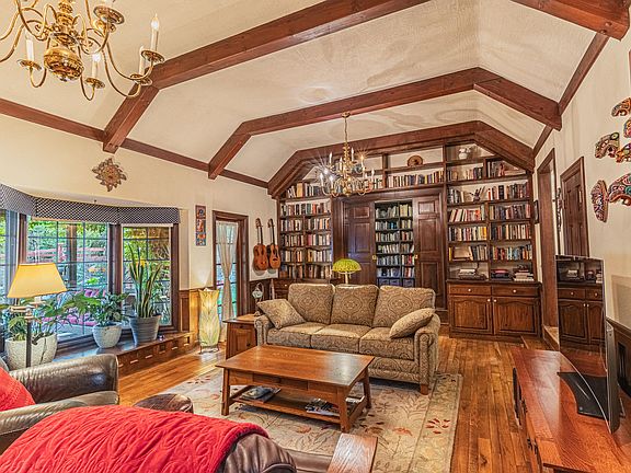 Charming Custom English Tudor Home in Upper River Heights in Grants Pass. This 2114 Sq Ft Home features 3 Bedrooms (one currently being used as library/office), 2.5 Baths on 2.85 Acres. Large Living Room features Vaulted Ceilings, Exposed Wood Beams, Hardwood floors, Custom Built-in's, Wood burning Fireplace, Wet Bar, Bay Windows & French Doors leading to Covered Patio. Eat-in Kitchen was renovated 2020 with Shaker Cabinets, Quartz Counter Tops, Kitchen Aid Appliances, Copper Farmhouse Sink, Copper Prep Sink w/ Pot Filler and Radiant Heat Tile Floor. Pantry, Laundry Room & 1/2 Bath located off the Kitchen. Beautiful Formal Dining Room w/ Hardwood Floor, Built-in Hutch, Wainscoting & Bay Window. Spacious Primary Bedroom w/ Bay Window, Walk-in Closet & ensuite Bath with Large Tub/Shower, Double Vanity w/ Quartz Counter, and Radiant Heat in the Floor. Large 2nd Bedroom w/attached Updated Bath. Attached 2 Car Garage off Breezeway & Wisteria Covered Patio w/Lovely Entertaining area.
