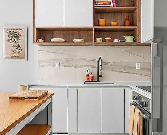Refined details enhance the home's character, including oversized 7-inch wide-plank hardwood floors and classic hardware. The thoughtfully designed kitchen is equipped with custom Leicht cabinetry from Germany, Quartz countertops, and a Calacatta Gold porcelain backsplash. High-end appliances include a Bosch oven and dishwasher, a Fisher & Paykel refrigerator, a Frigidaire cooktop, and an XO vent hood. The apartment also features an in-unit washer and dryer for added convenience.