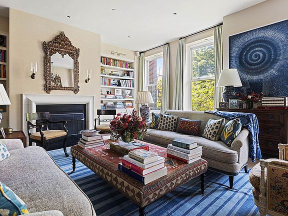Tucked away on a tranquil residential block, the sun-filled, open-concept living room is anchored by a wood-burning fireplace and flows seamlessly to a private terrace—offering a peaceful retreat and a rare blend of indoor-outdoor living. Interiors by CeCe Barfield Inc. feature a remodeled kitchen with a Bluestar oven, custom-built storage, concealed drinks fridge, re-tiled primary bath, curated wallpaper, and a reimagined fireplace mantel. High ceilings and refined finishes complete the space.