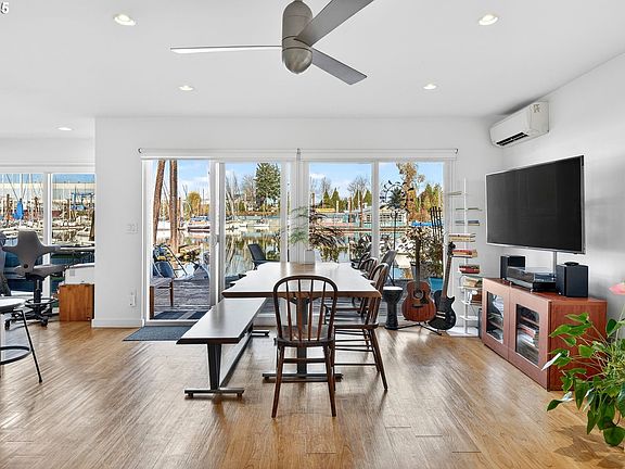 This bright and modern floating home is move-in ready and features a wall of windows and sliding glass door looking onto the water. It has an open plan living room and kitchen area with stainless steel gas appliances, including JENN-AIR range and dishwasher, slab counter tops, peninsula with eat-bar, and good storage. Cozy up to the gas stove in the wintertime and take in the view. In the warmer months, enjoy the roomy partially covered deck and all of the activity of floating house living on the river. There is even room to park your boat in front of the deck. The bathroom has double sinks and tile flooring, and there’s a laundry room with washer, dryer, and extra storage. This well maintained home is ideally situated on a part of the river where the floating traffic is entertaining, and it also happens to be a location where people almost always follow the no-wake zone rules. It's immediately across from the Island Cafe, and just a short boat ride away are two other floating restaurants. So much to eat, see, and do!
