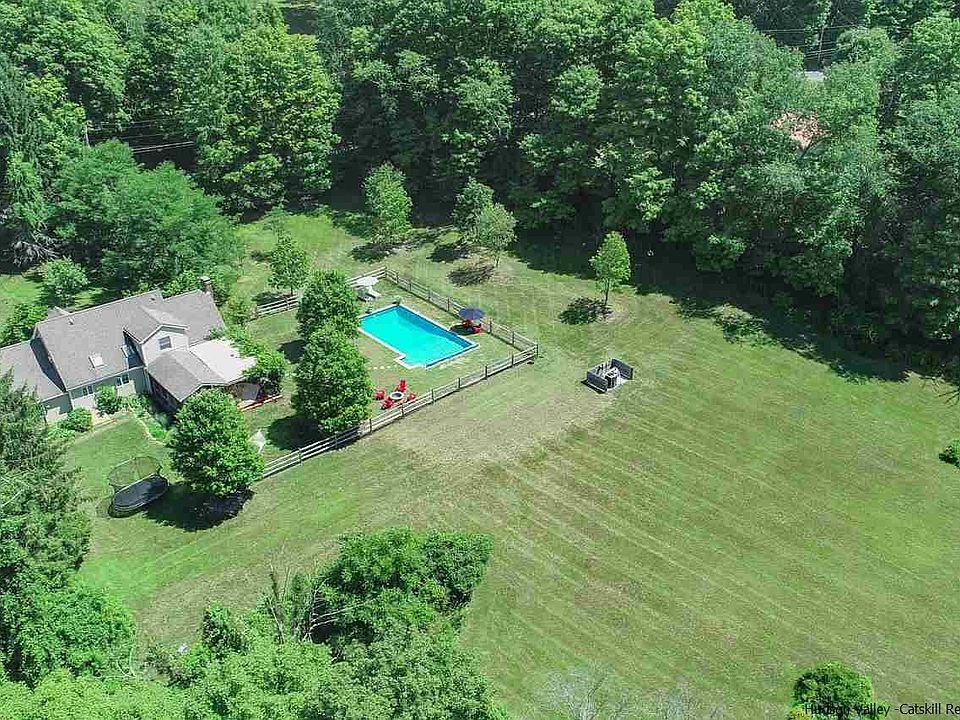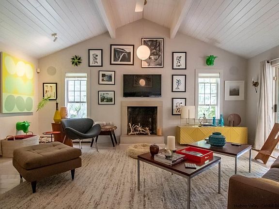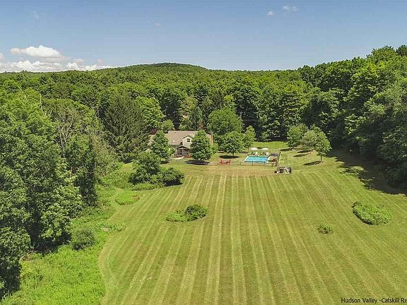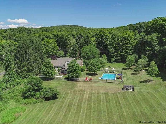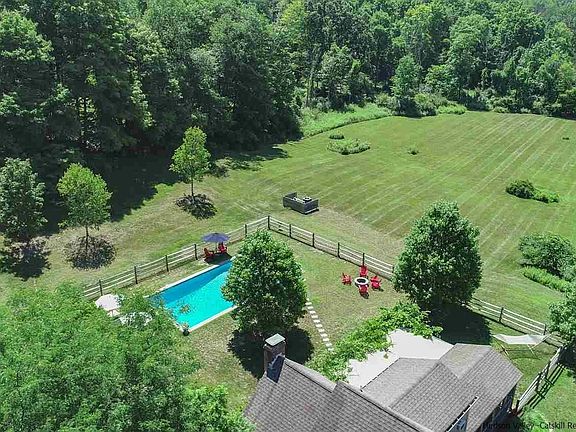 Picturesque contemporary cape privately sited and located on quiet country road just minutes to Stone Ridge, High Falls, Woodstock and Kingston. On the outside a beautifully landscaped country cape. On the inside a stunning contemporary home with wide open spaces with soaring ceilings flowing beautifully into one another. The beautifully well outfitted kitchen has skylites, high ceilings, gleaming white subway tiled walls, wood cabinets, custom wood shelving and concrete countertops that opens to a formal diningroom and then graciously into an impressive living room. Front and center is a brick fireplace with a simple concrete surround. Whitewashed wood floors throughout the main living space add light and natural beauty. The dining room opens to a perfectly comfortable 21x11.5 screened porch which leads to a 13 ft pergola covered deck with direct access to the living room. There is a bedroom with bathroom access on the main floor and two light filled guestrooms and bathroom on the second floor. The lower level is an amazing open space. Easily both a family room, office and den. If outdoor living makes you smile this is the place for you. Everything that one could desire is there for your enjoyment. From a cozy firepit, an inground pool with many seating areas around it, an oversized screened porch and a pergola covered deck. And what a vista..... Beauty & Peace and can be yours to enjoy.